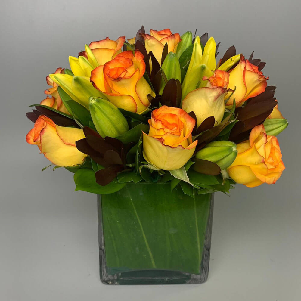 #105 Hermoso diseño con 1 docena de Rosas, Tiger Lily, Leucadendrom con detalle de Aspidistra sumergida en base de cristal transparente.