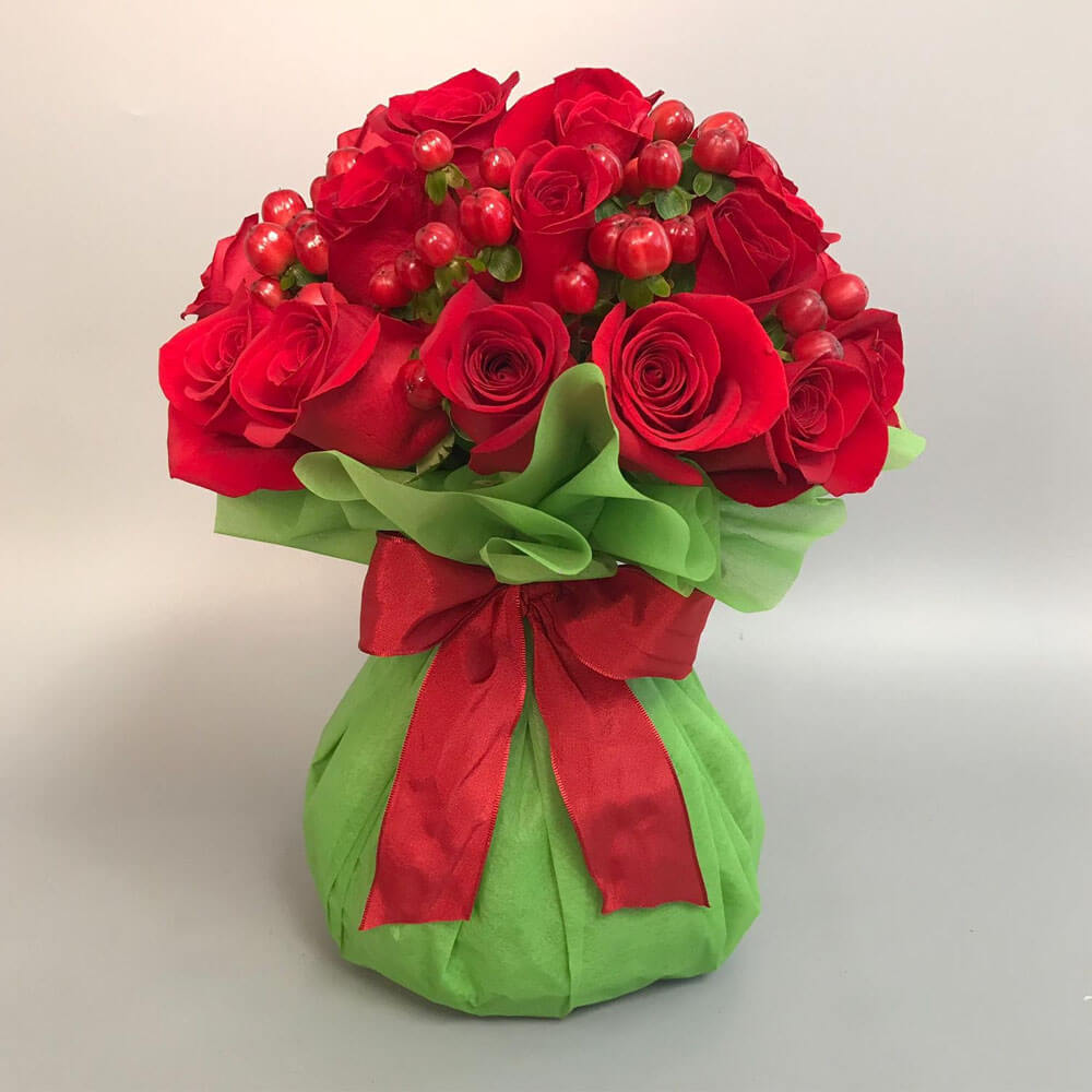 #157 Pucha elaborada con 2 docenas de Rosas e Hypericum, delicadamente arregladas en nuestros bouquets con agua.