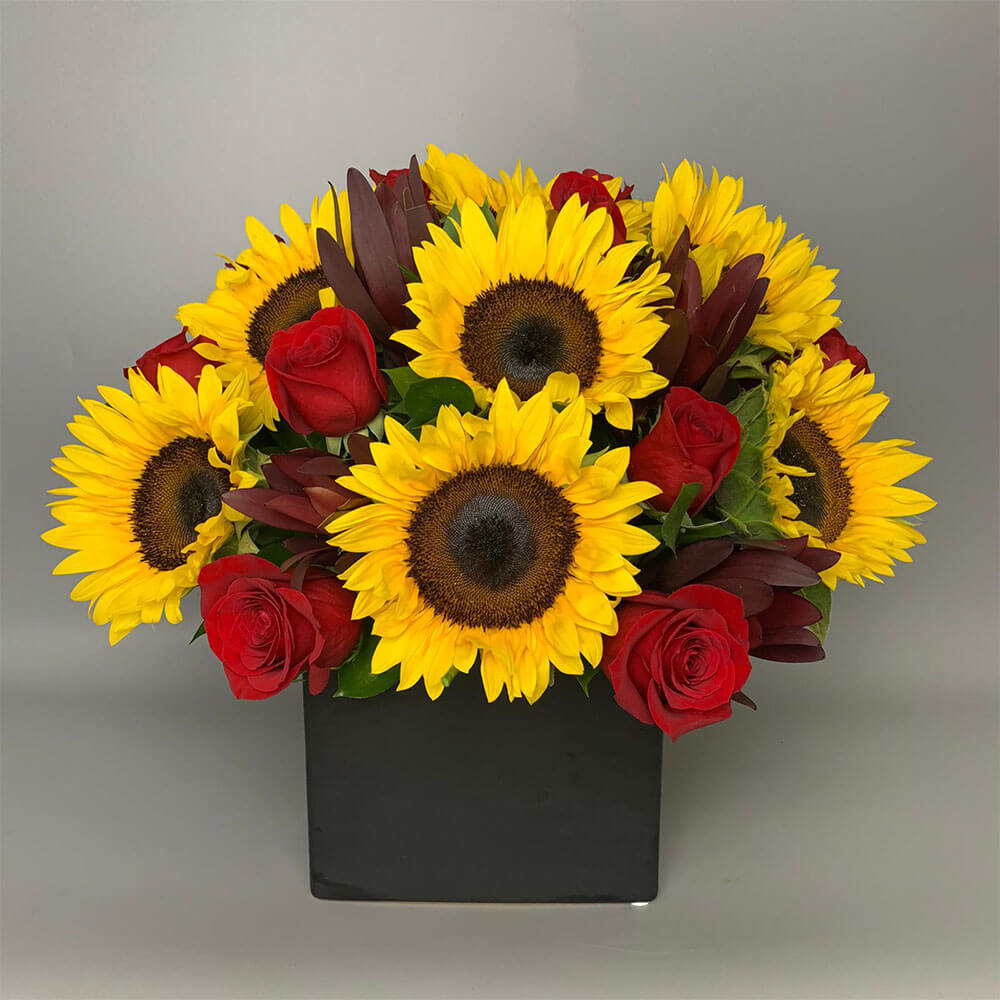 #177 Diseño preparado con 1 docena de Rosas, Girasoles, Leucadendrum y un toque de Ruscus en base de cerámica negra.