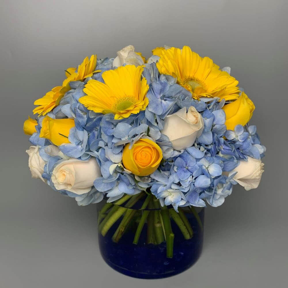 #22 Adorable diseño preparado con 18 unidades de Rosas, Hortensia y Gerberas, en base de cristal.