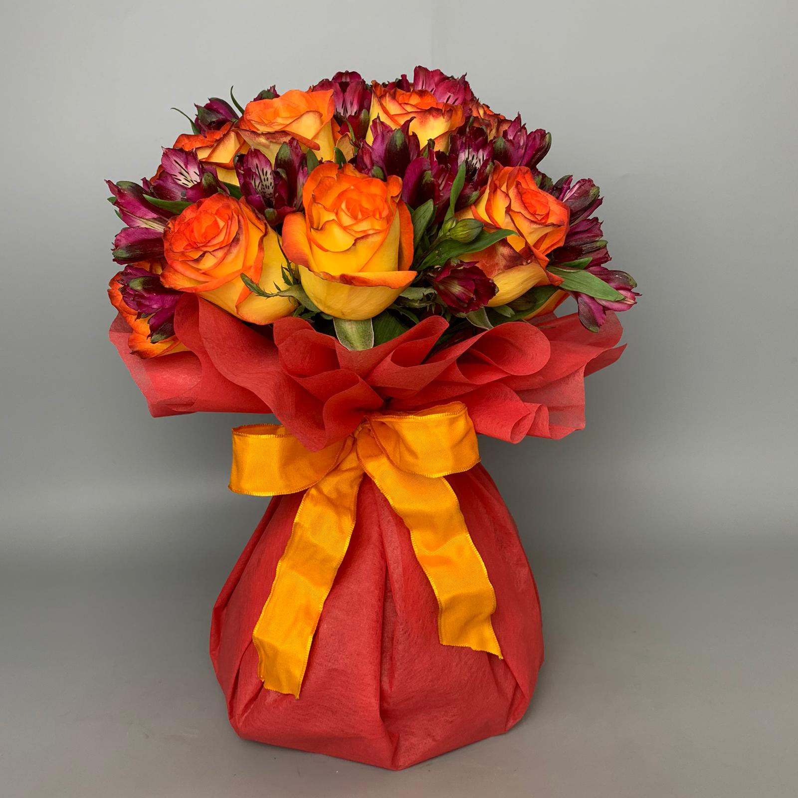 #268 Encantador bouquet en agua con 18 unidades de Rosas y Alstroemeria, filato paper y lazo.