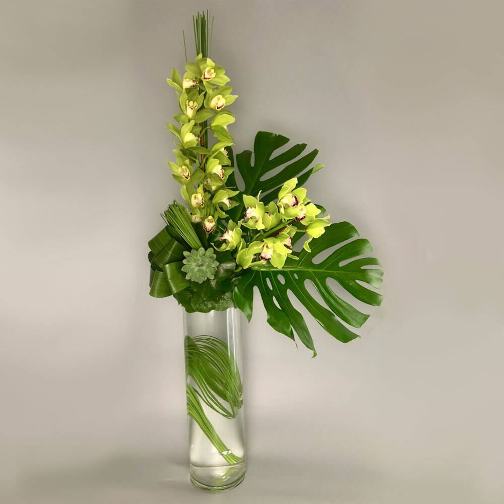#315 Impactante diseño con tallos de Orquídea Cymbidium como protagonistas, embellecidos con Follajes de temporada que realzan la majestuosidad de su color y conectan con un hermoso detalle de suculenta. Una hermosa puesta en escena en base cilíndrica de cristal transparente.