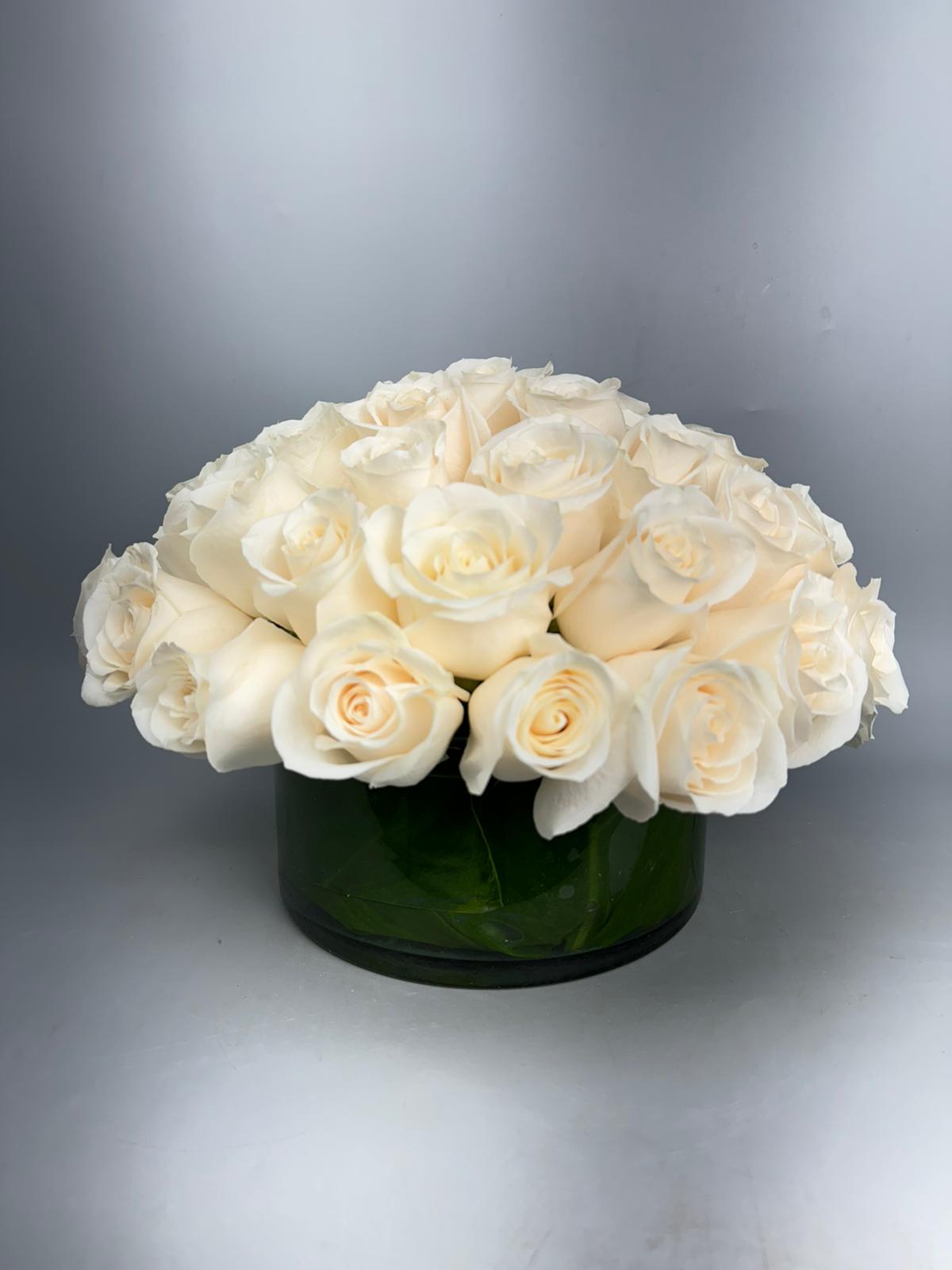 #37 Llamativo diseño elaborado con 36 unidades de Rosa, en base de cristal.