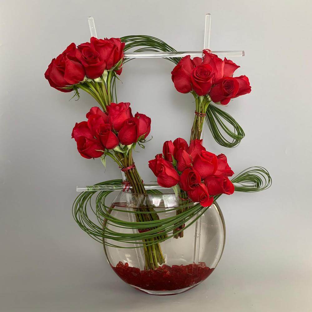 #385 Imponente arreglo con 4 docenas de Rosas sectorizadas en 4 puchas, con detalles de Lily Grass en moderna base de cristal transparente con detalles de cristal molido en su fondo.