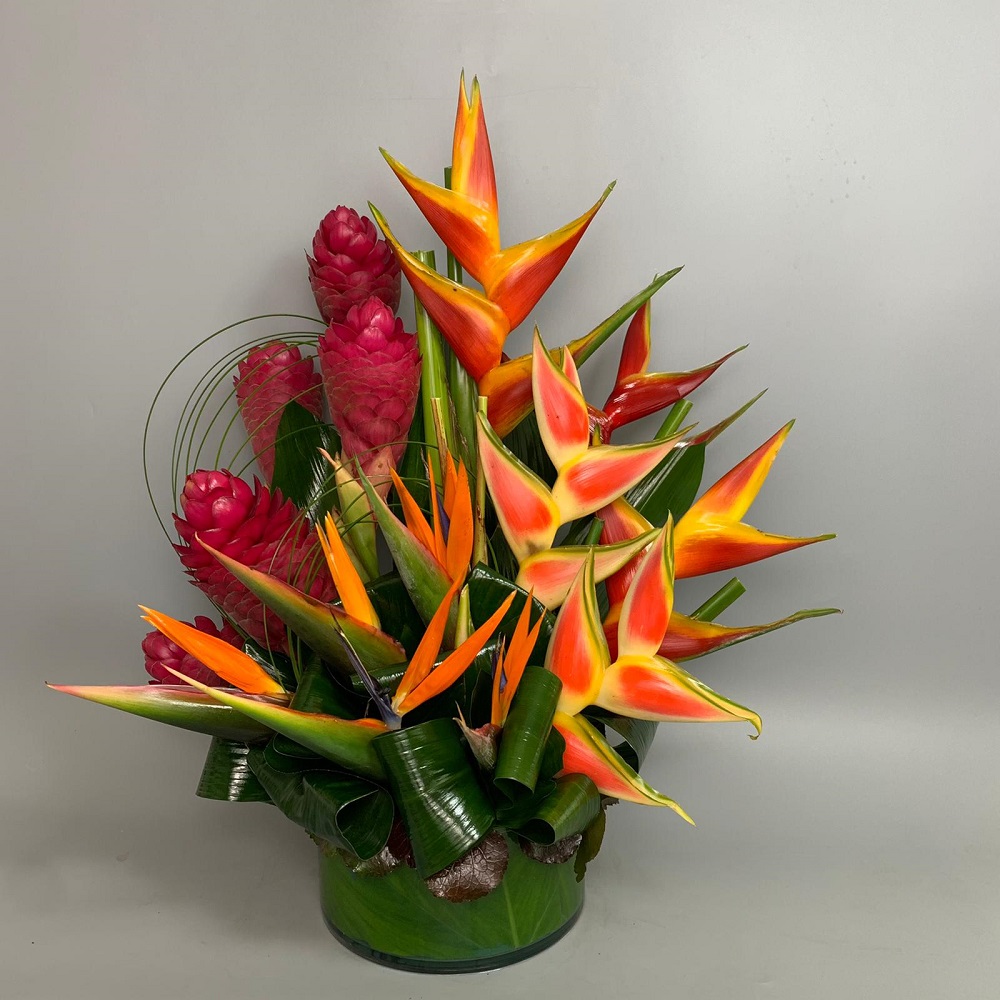 #49 Vibrante diseño tropical preparado con Heliconias, Ginger, Aves del Paraíso, Flexi Grass y Follaje de temporada en base de cristal transparente.