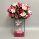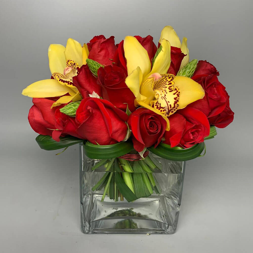#55 Colorido arreglo tipo pucha diseñado con 2 docenas de Rosas, Cymbidium, Estrella de Belén y loops de Lily Grass en base cuadrada de cristal transparente.