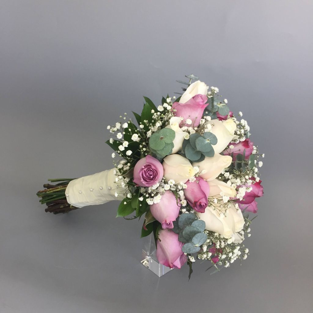 #576 Bouquet de Novia con 2 docenas de Rosa, Eucalipto baby , Gypsophilla, Follaje de temporada y cinta.