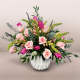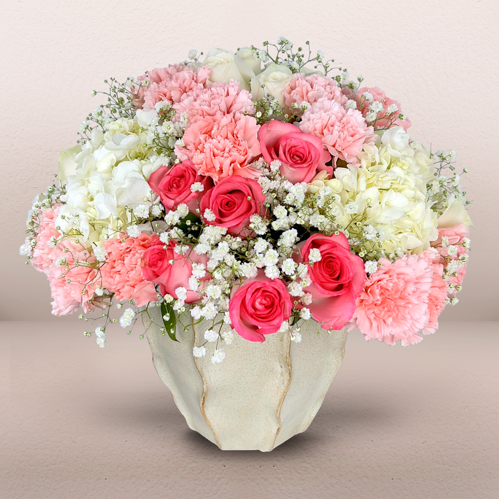 #654 Tonos suaves como solo el amor que Mamá sabe dar. Este arreglo combina rosas y claveles en tonos rosados, hortensias blancas y gypsophila presentadas en una hermosa base texturizada que resalta la elegancia y sutileza de esta composición.