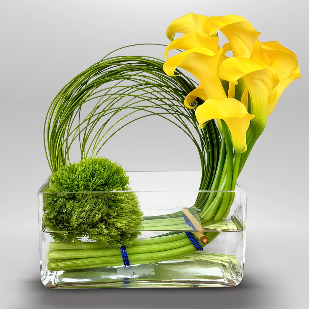 #683 Un diseño contemporáneo y lleno de personalidad: calas amarillas enmarcadas por líneas de flexigrass en un elegante movimiento circular, acompañadas de una esfera verde elaborada en dianthus que evocan fuerza y equilibrio.