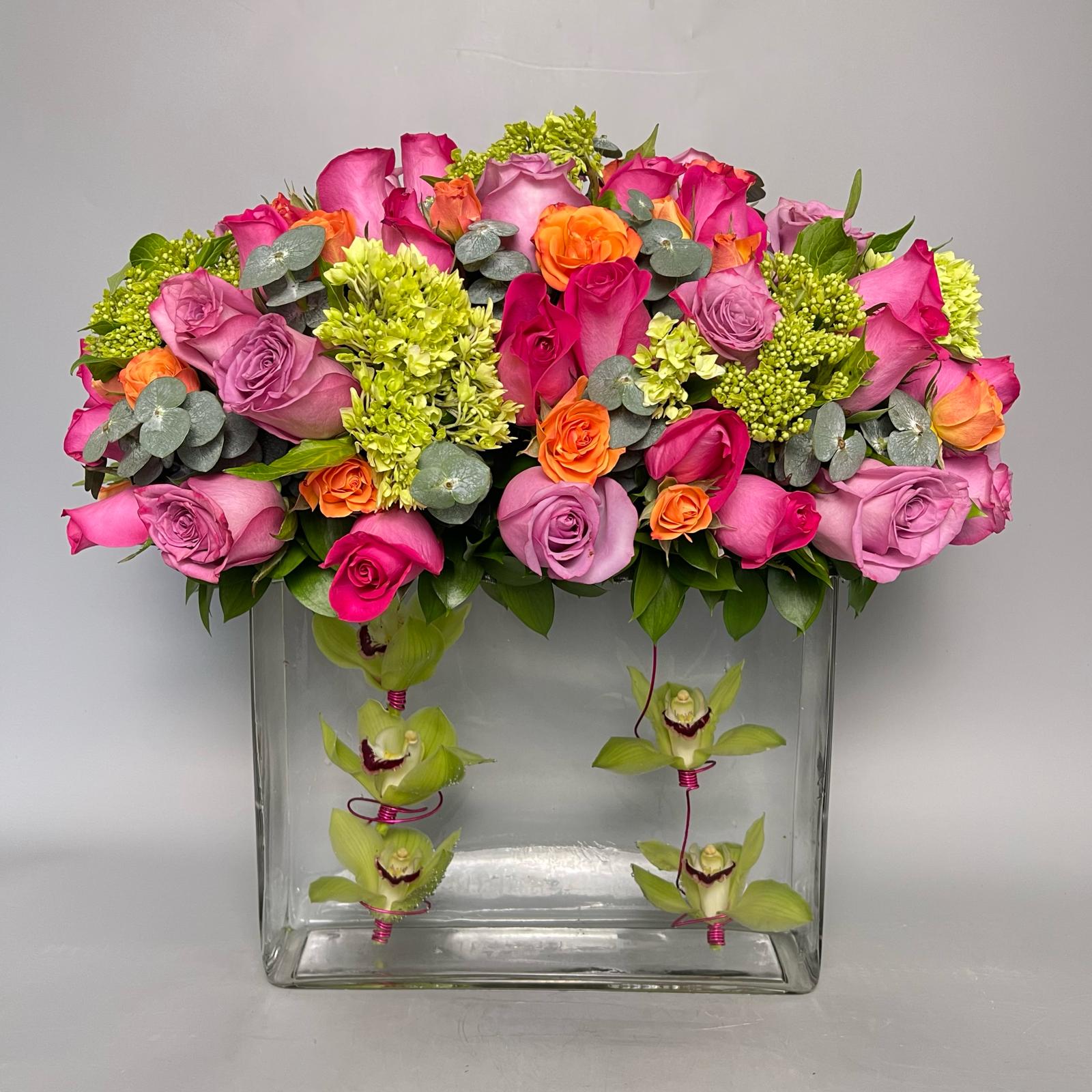 #156 Encantador diseño elaborado con cuatro docenas de Rosa, Hortensia, Rosa Mini, Eucalipto y un delicado diseño subacuático con flores de Cymbidium en elegante base de cristal.