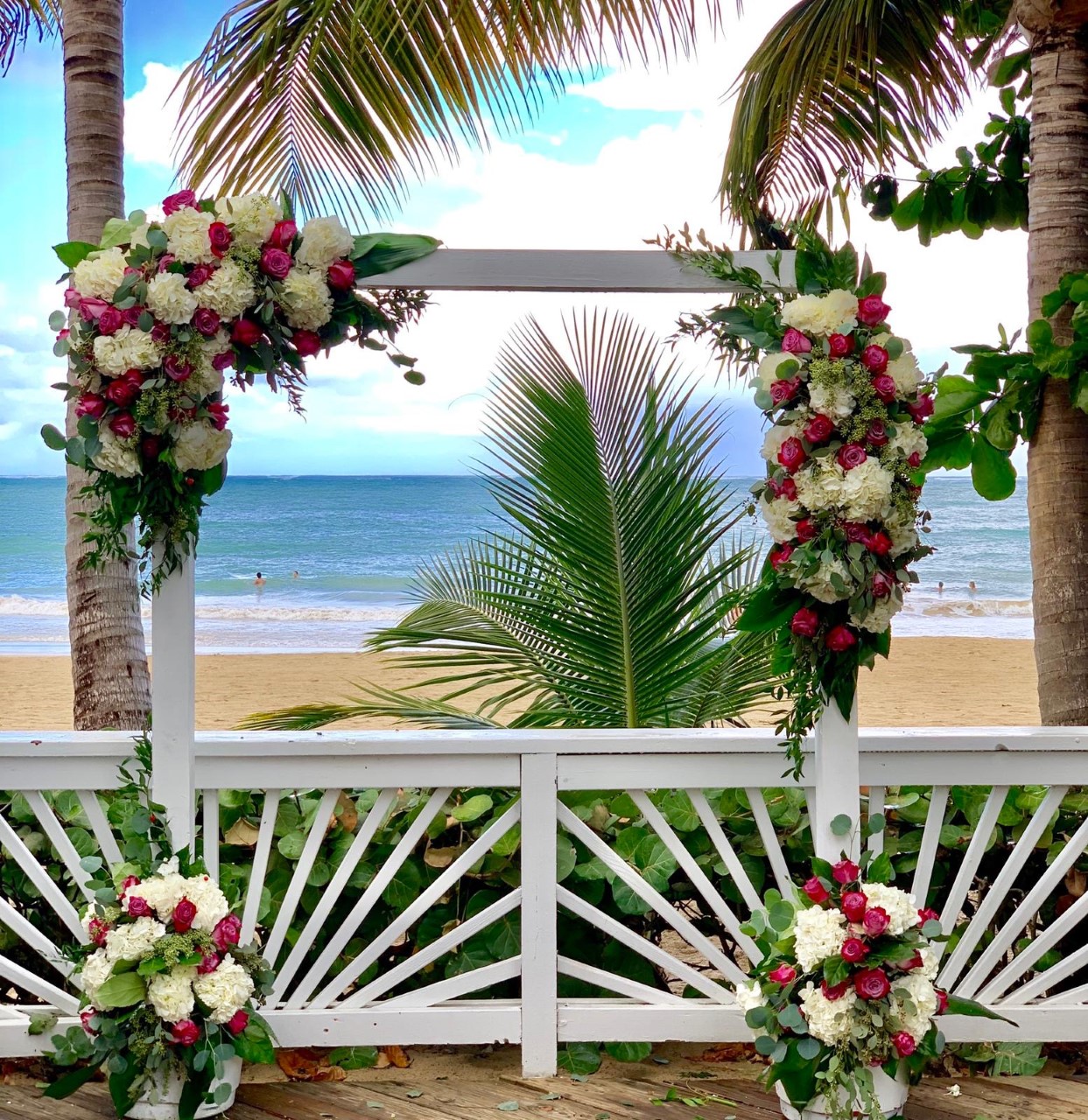 Arco decorado con rosas, hortensias, ruscus italiano, eucalipto y follajes. Incluye el alquiler del arco.