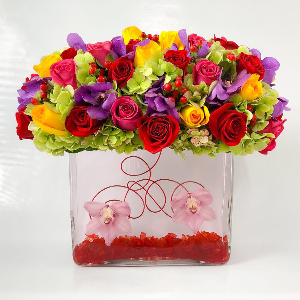 #97 Este vibrante diseño esta compuesto por rosas en colores surtidos, hermosas hortensias “antique “, dendrobium morado, hypericum y flores de cymbidium sumergidas en el agua
