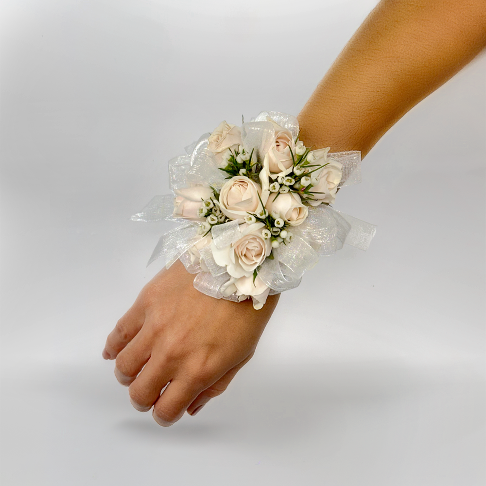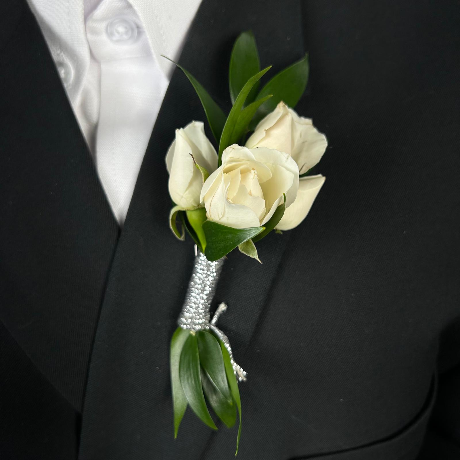 #566 Este boutonniere combina delicadas mini rosas marfil con toques de follaje, realzado por un acabo en cintilla plateada. Un detalle perfecto para complementar un look refinado en esa ocasión tan especial.