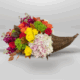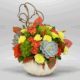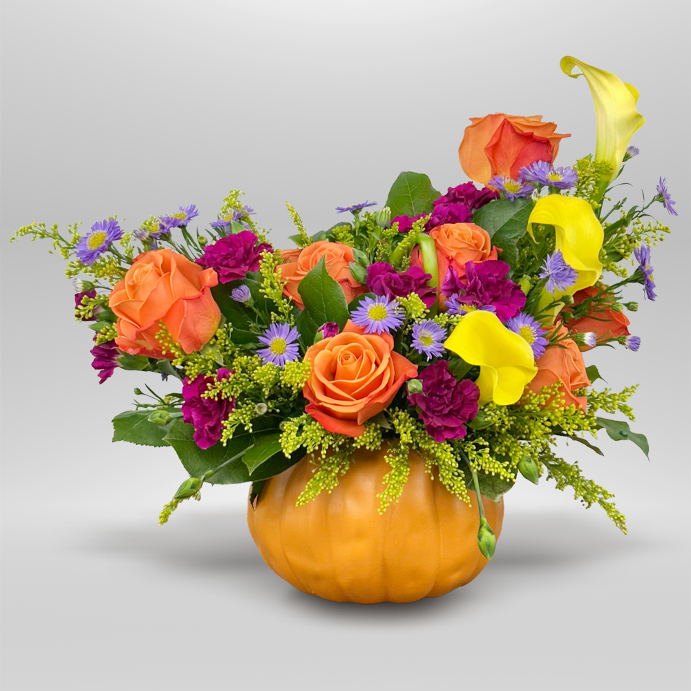 #182 Un toque de otoño lleno de vida. Este arreglo, presentado en una encantadora calabaza, combina rosas entonos naranjas, lirios cala amarillos y claveles púrpura en una composición que irradia alegría, color y el espíritu acogedor de la temporada.