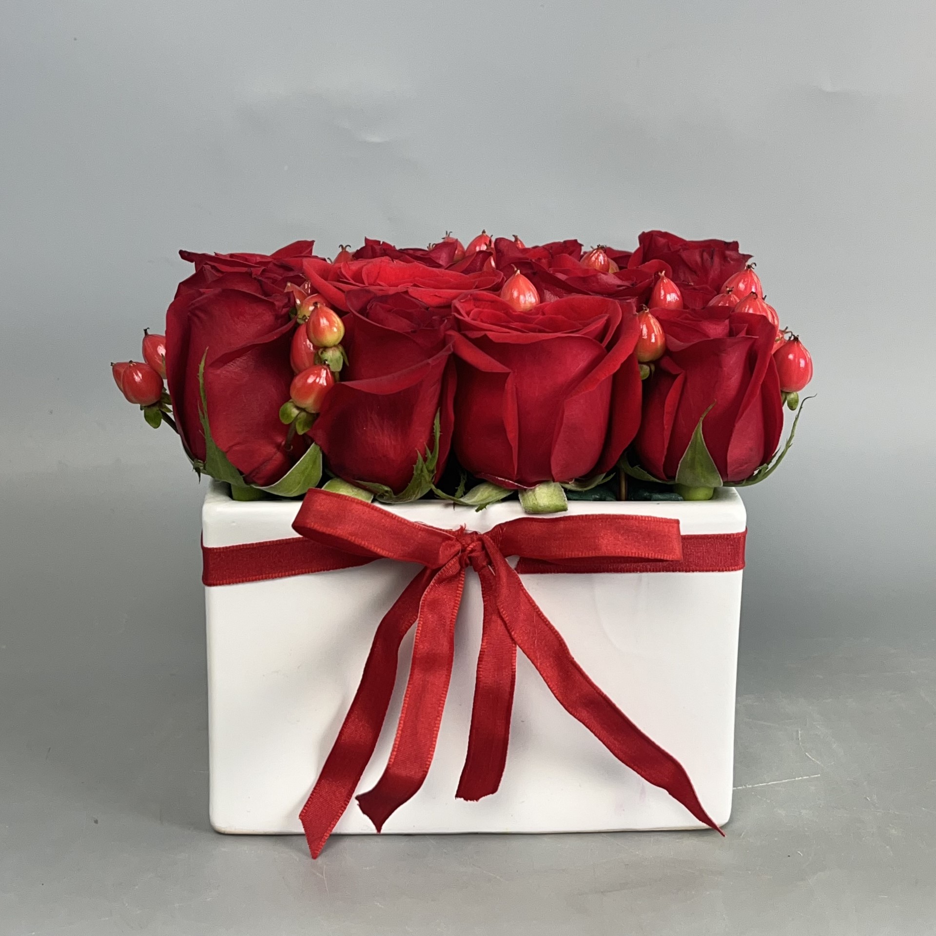 #693 Nuestro adorable diseño de San Valentín, elaborado con 16 unidades de Rosas e Hypericum en base de cerámica blanca.