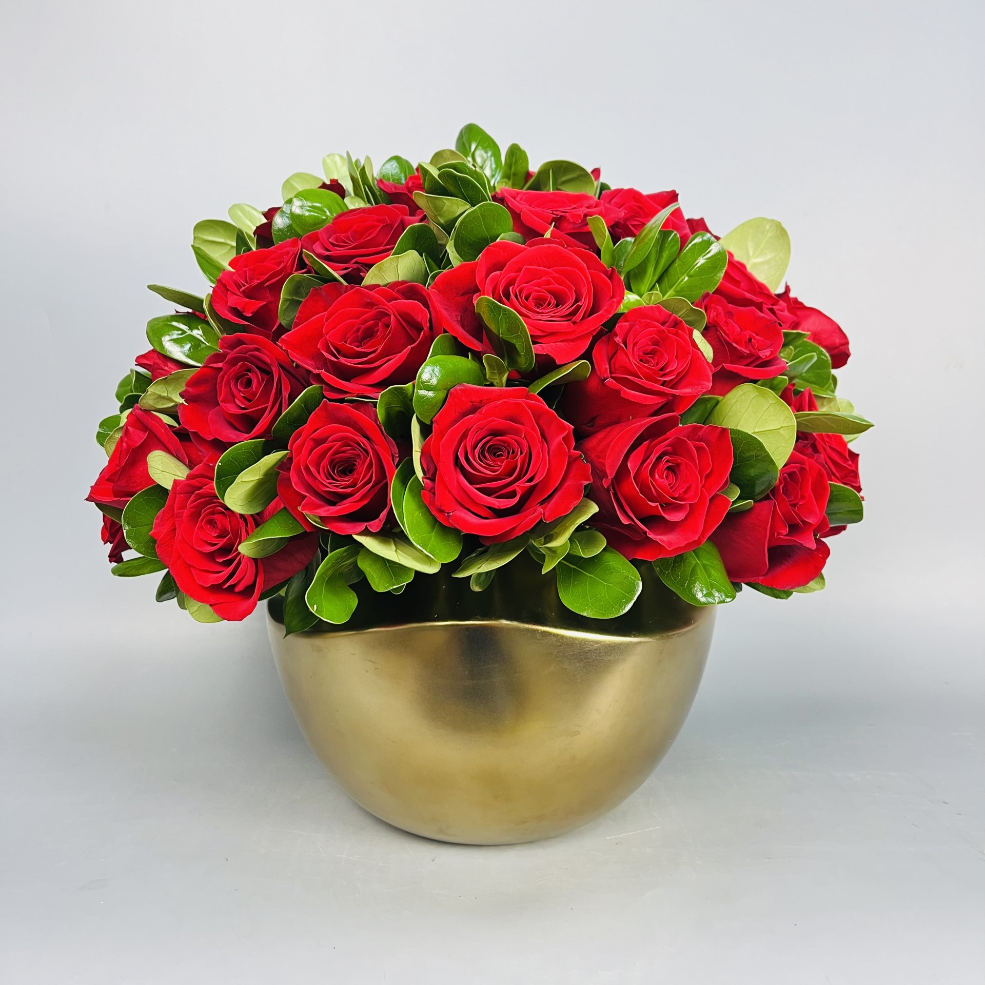 #28 Impactante diseño elaborado con cuatro docenas de Rosas, Brillantina y Ruscus, presentado en una elegante y moderna base dorada creando una armonía perfecta entre rojo, verde y dorado.