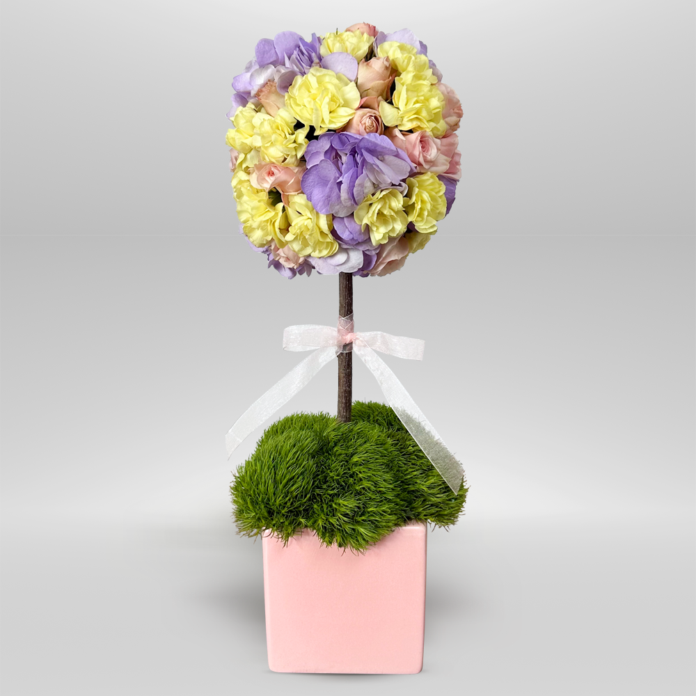 #229 Encantador topiario en tonos suaves y delicados, perfecto para dar la bienvenida a una nueva vida. La esfera floral superior combina claveles amarillos, hortensias moradas y mini rosas en suaves matices pastel, creando una composición dulce y armoniosa. En la base, un pequeño jardín de dianthus verde aporta frescura y textura, complementado por un delicado lazo sobre una base de cerámica rosada.