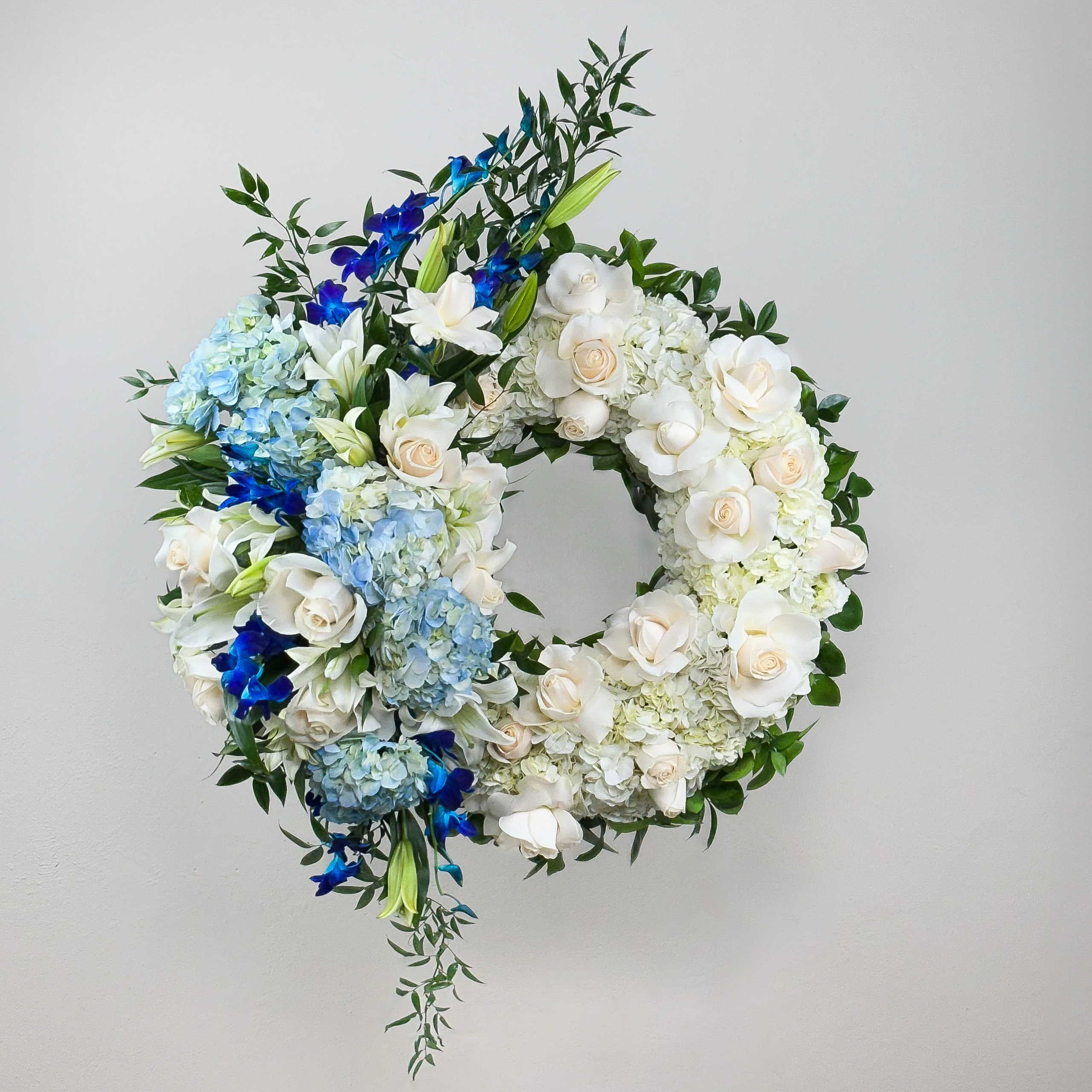 #425 Elegante corona fúnebre diseñada para rendir un homenaje lleno de paz y luz. Elaborada con rosas blancas, hortensias en tonos azules y cremosos, lirios blancos, orquídeas azules y acentos de ruscus italiano, esta pieza simboliza el descanso eterno y la pureza del alma. Una composición serena y delicada para despedir con amor y respeto a un ser querido