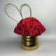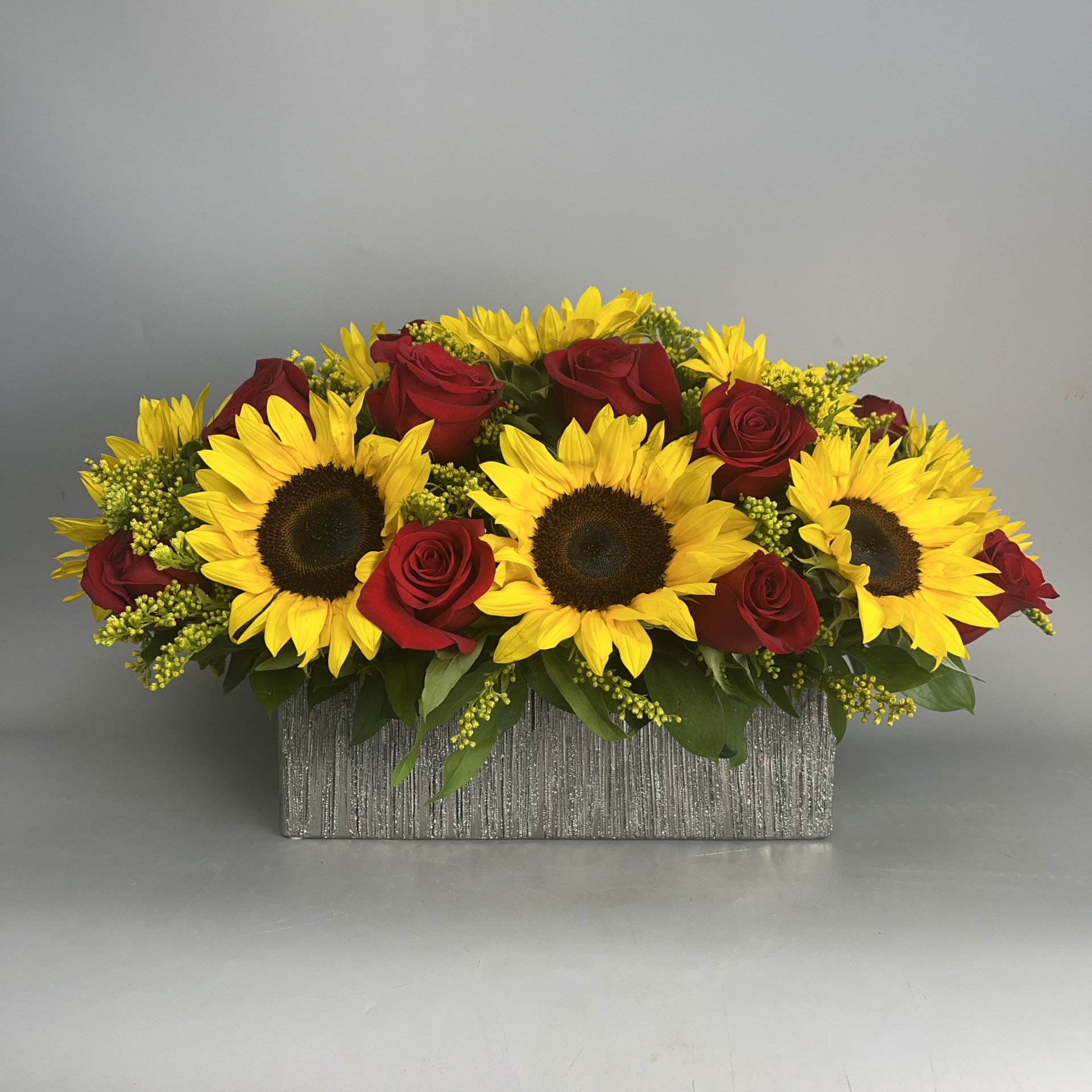 #692 Vibrante diseño elaborado con 18 unidades de Rosas, Ruscus y Solidaster en base de cerámica plateada.