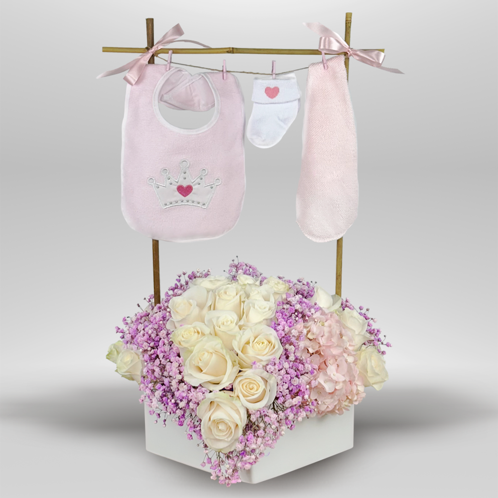 #140 Dale la bienvenida a la nueva integrante de la familia con un detalle lleno de ternura. Rosas blancas y flores en tonos rosados se unen en una delicada base acompañada de adorables accesorios de bebé. Un arreglo que transmite amor, pureza y la dulzura del primer encuentro.