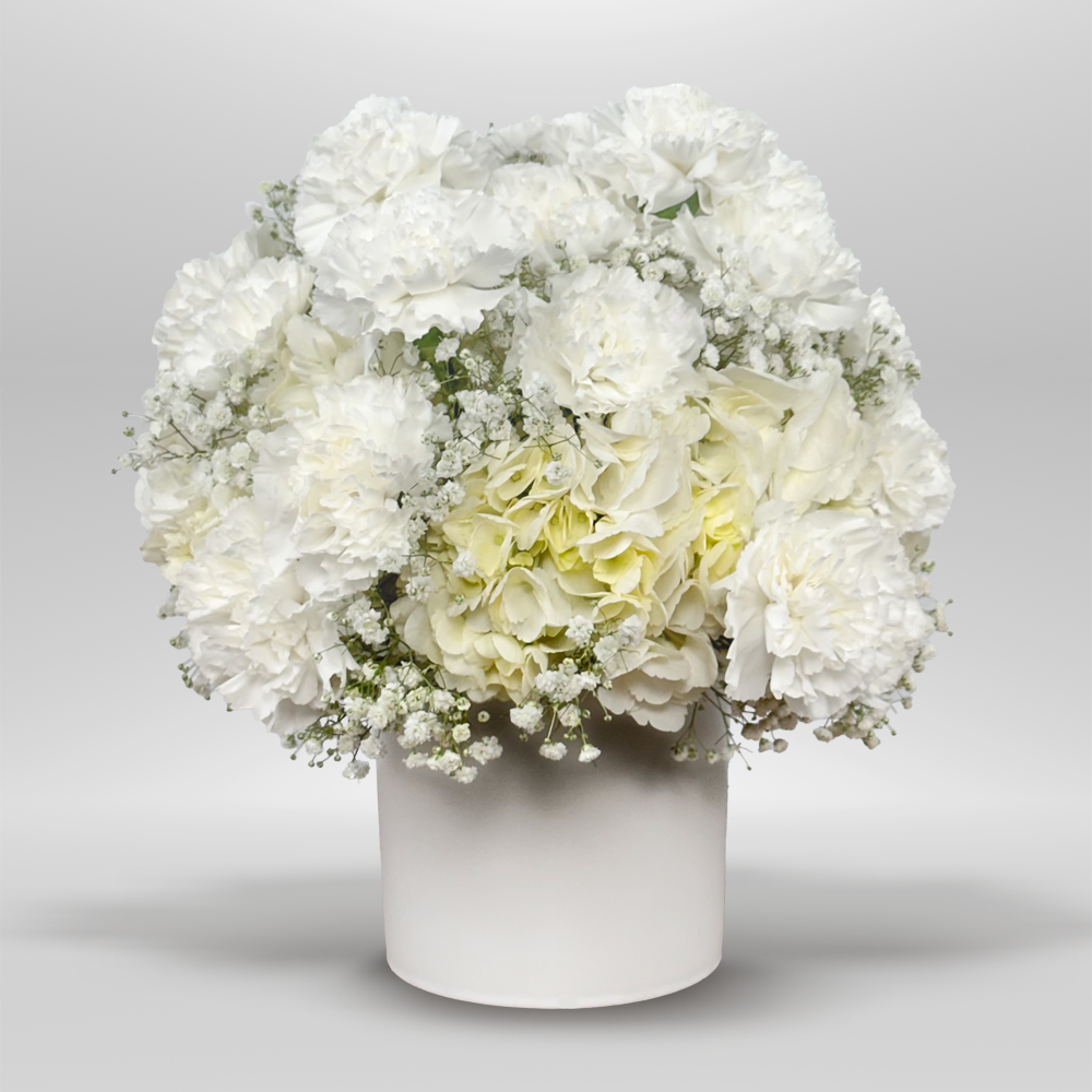 #188 Encantador y delicado diseño con hortensias y claveles blancos que transmiten la suavidad y la pureza de las hortensias y los claveles embellecidos con gypsophila, en base de cerámica blanca.