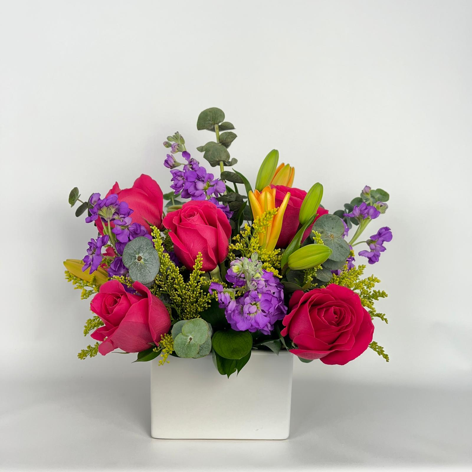 #16 Hermosa explosión de colores elaborada con Rosas, Lirios, solidaster, follaje de temporada en base de cerámica.