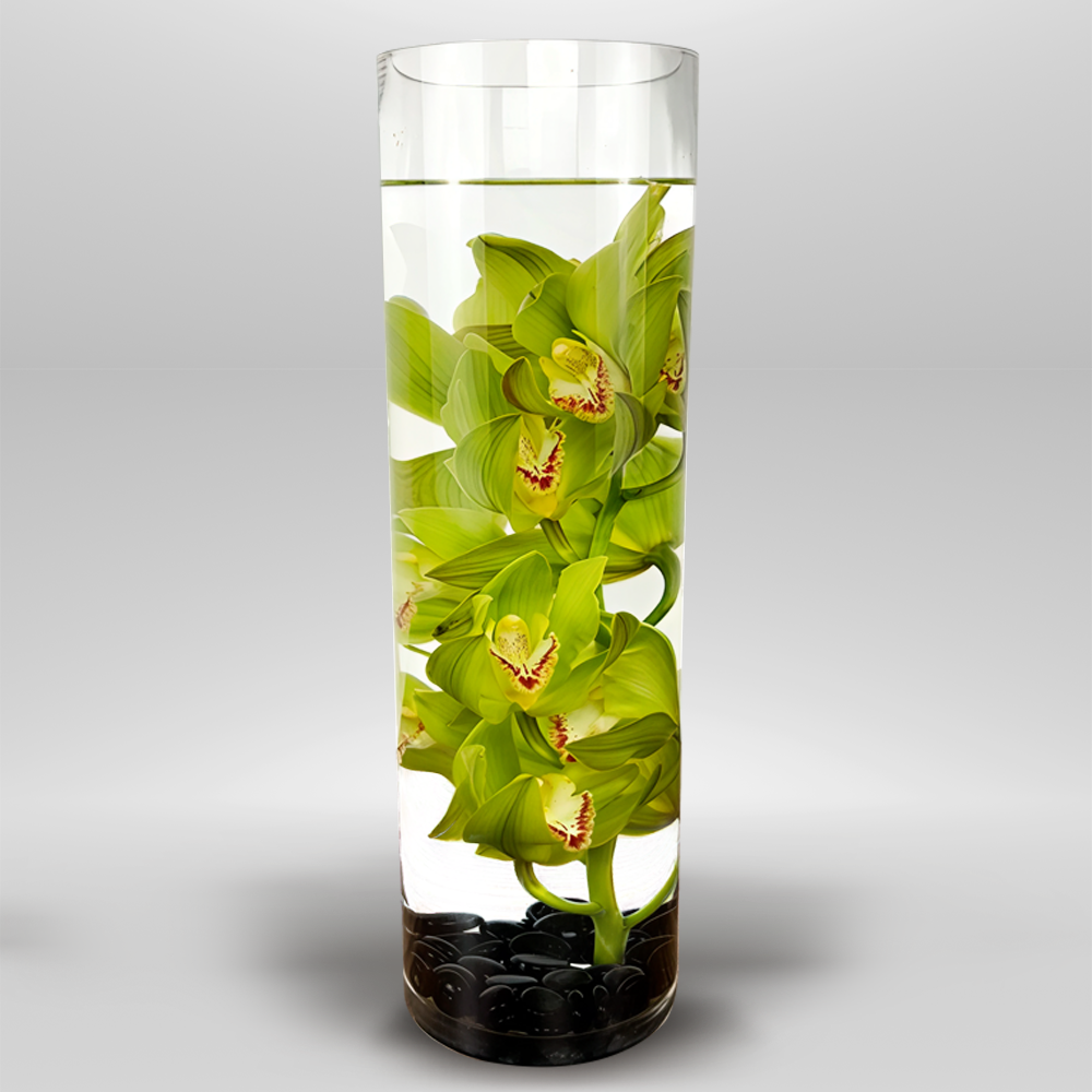 #680 Un detalle moderno y sofisticado para el espacio favorito de papá. Este elegante cilindro de cristal realza cualquier ambiente con la belleza única de un cymbidium verde sumergido en agua y acompañado de piedras decorativas. Ideal para su escritorio, estudio o sala de estar.”