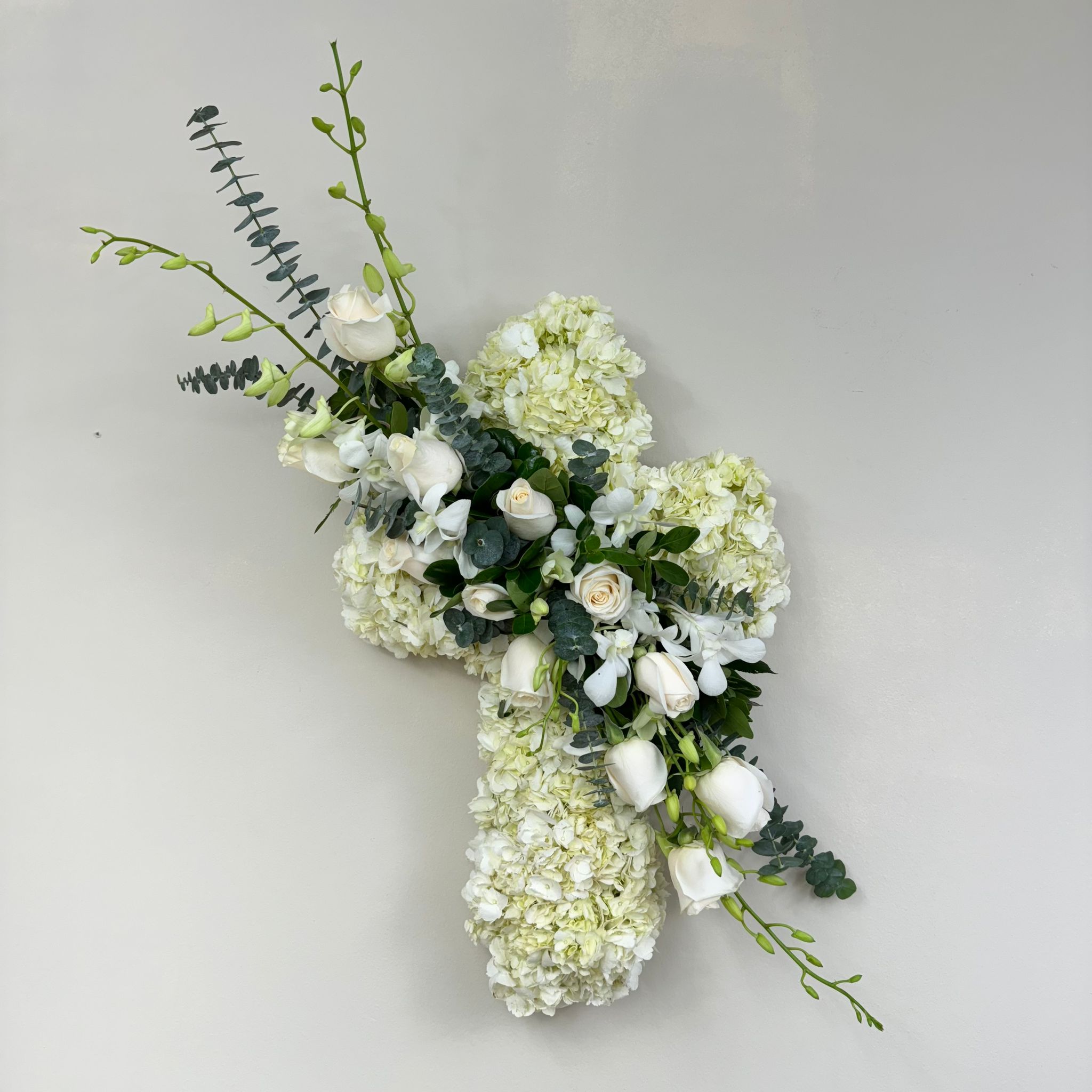 #160 Hermoso diseño en forma de cruz elaborado con Rosa, Hortensias, Orquídeas y Eucalipto.