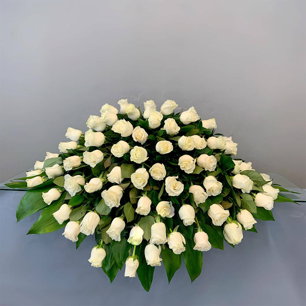 #163 Medio Casket preparado con 7 docenas de Rosas y Aspidistra.