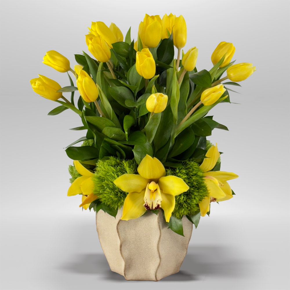 #205 Tulipanes amarillos emergen con fuerza y ligereza en este diseño vertical, acompañados por orquídeas cymbidium y dianthus verde en la base. Cada elemento está dispuesto con intención para resaltar el contraste entre altura, color y textura. La base de cerámica aporta un acabado contemporáneo sin restar protagonismo a las flores.